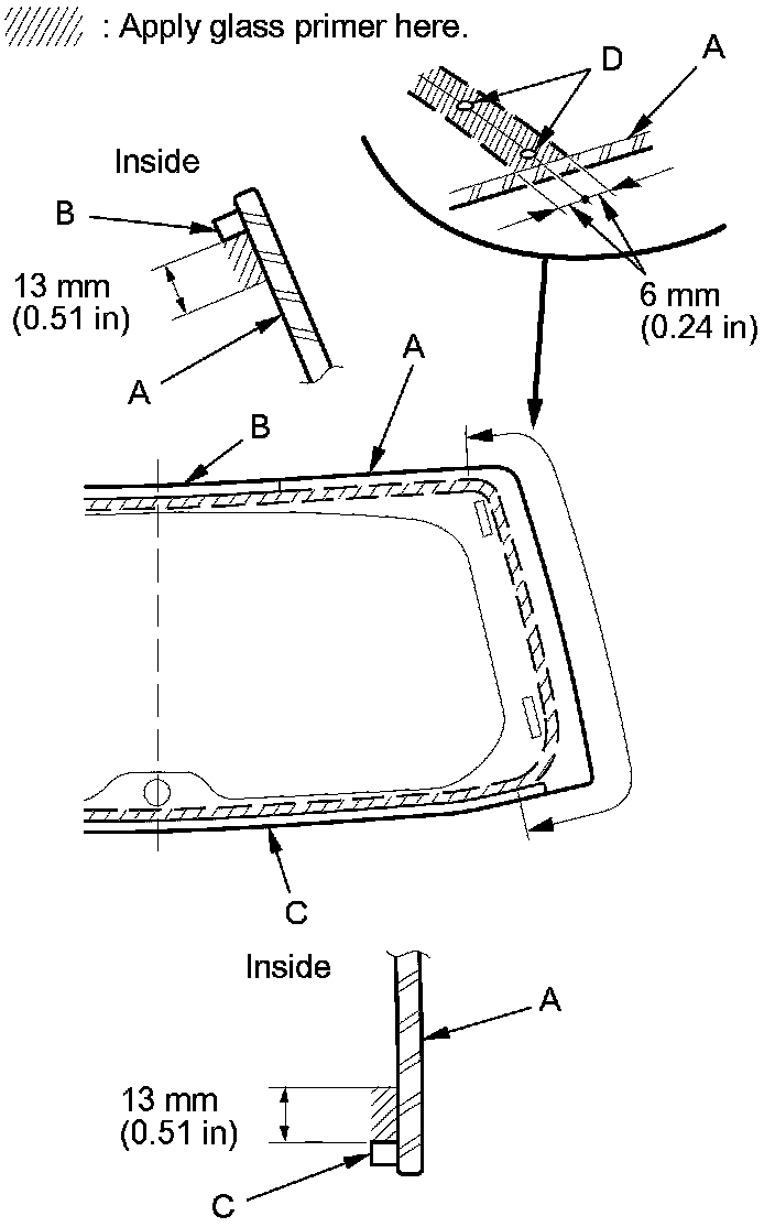 - Apply the glass primer to the corner areas of the rear window with the printed dots (D) on the rear window as a guide.