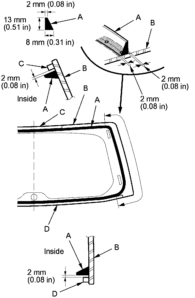 17. Put the cartridge in a caulking gun, and run a continuous bead of the adhesive (A) on the rear window (B) around the edge of the upper rubber dam (C) and the lower rubber dam (D) as shown: