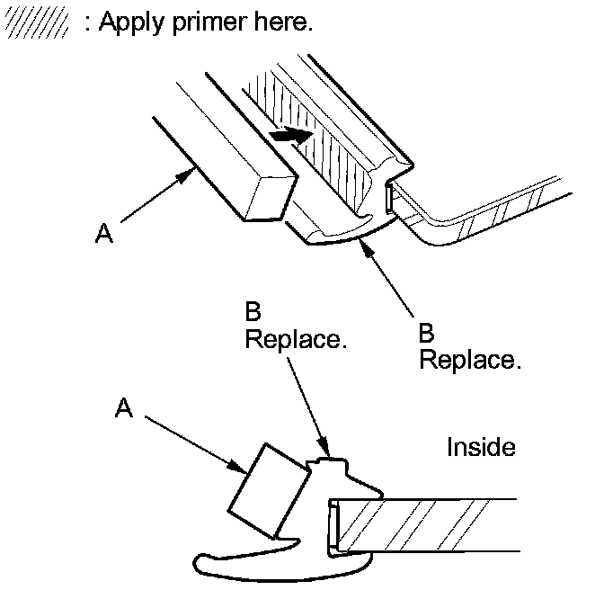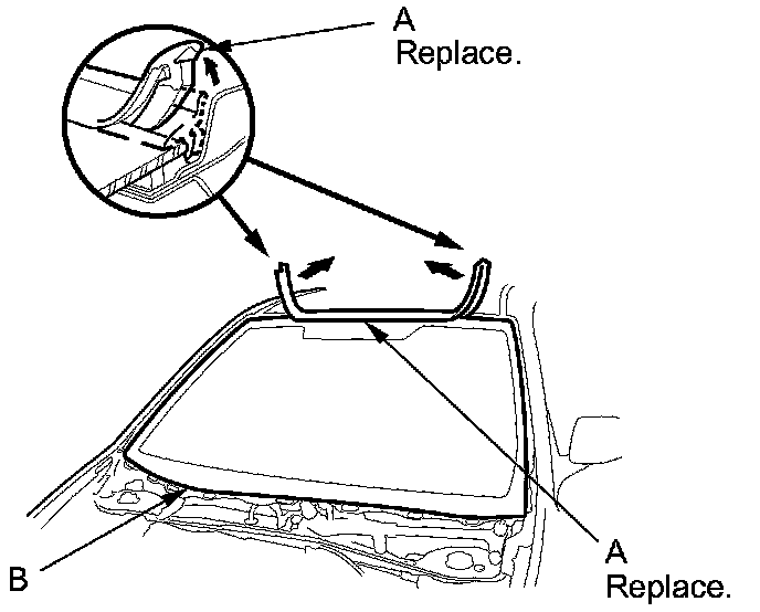 2. Remove the windshield molding (A) from the upper edge of the windshield (B). If necessary, cut the windshield molding with a utility knife.