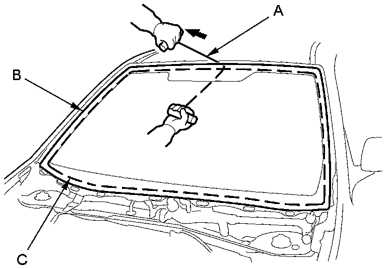 Carefully cut through the rubber dam and the adhesive (C) around the entire windshield.