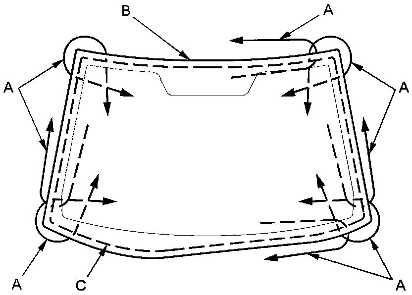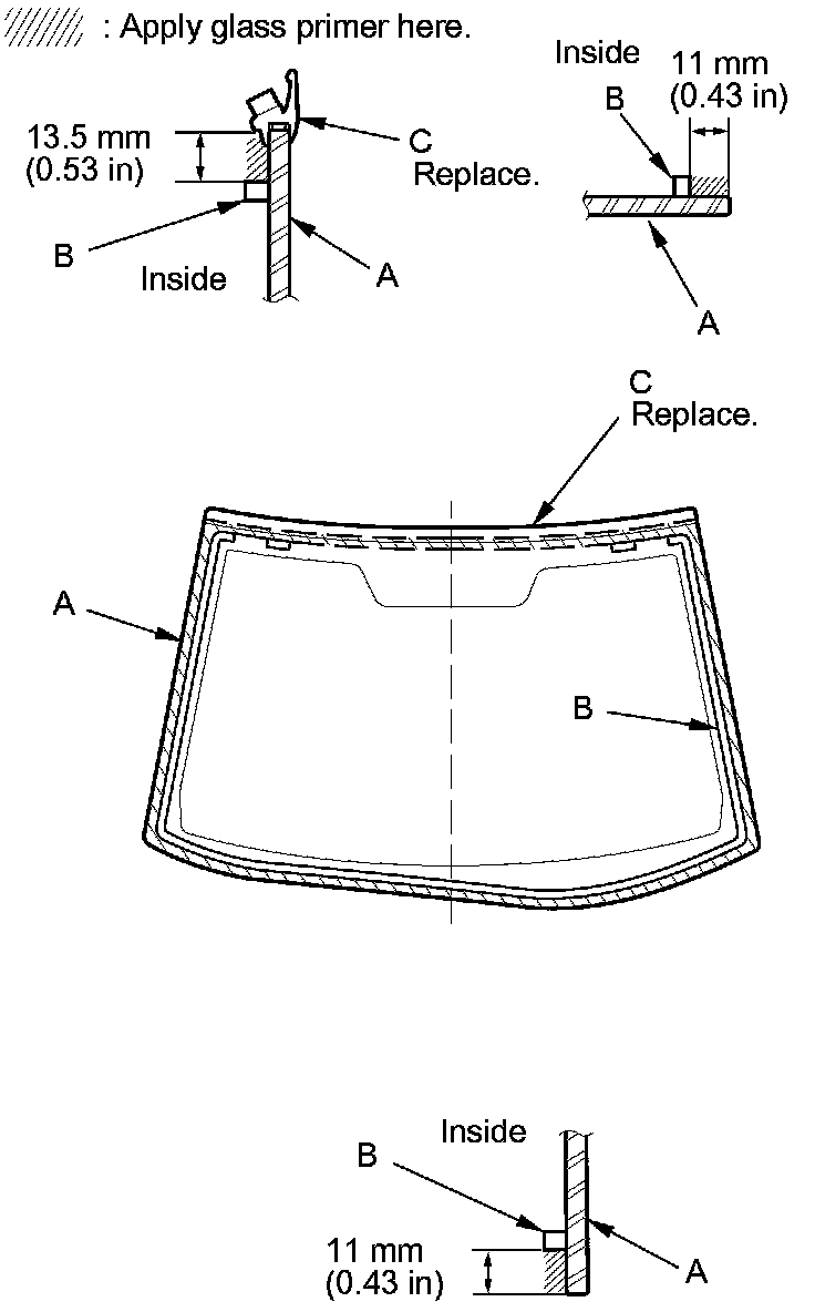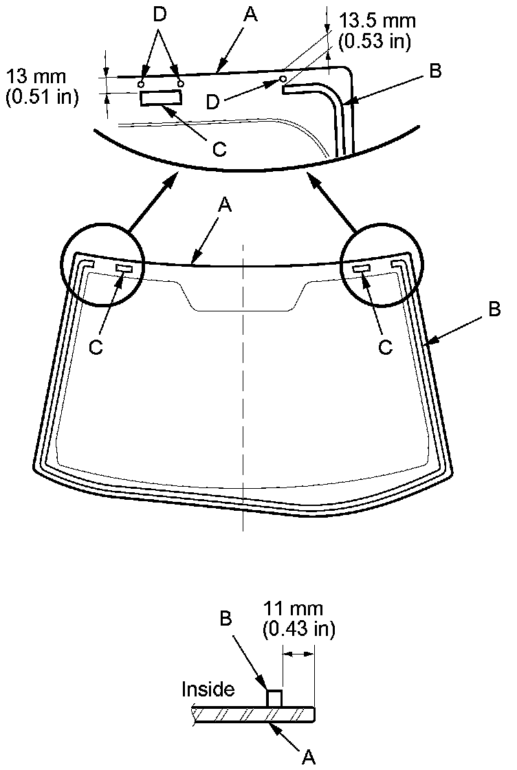 11. Apply glass primer to the upper clips mounting areas on the windshield (A), and let dry. Remove the adhesive backing and attach the rubber dam (B) and the upper clips (C) to the inside of the windshield as shown: