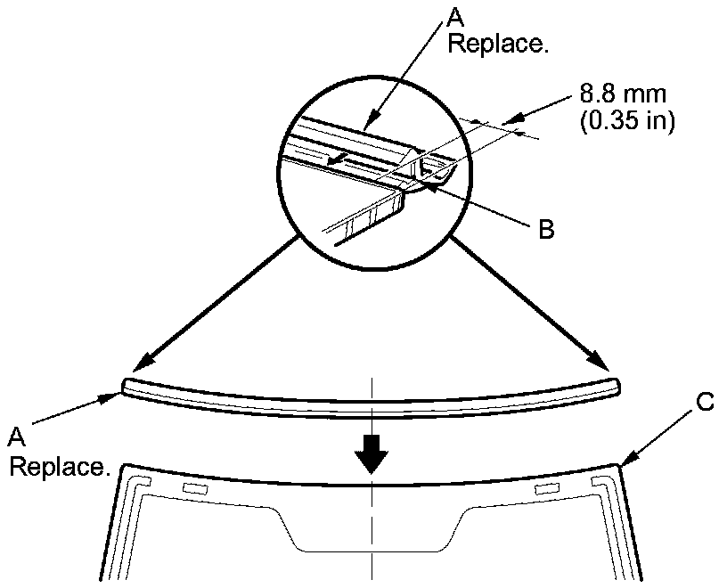 12. Attach the windshield molding (A) with adhesive tape (B) to the upper edge of the windshield (C). Be careful not to touch the windshield where the adhesive is applied.