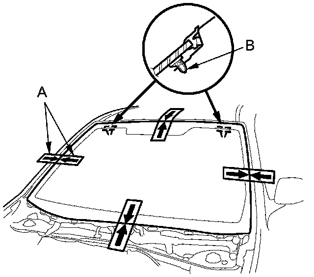 14. If you are installing a new windshield, set the windshield in the opening, and center it. Make alignment marks (A) across the windshield and the body with a grease pencil at the four points shown. Make sure both clips (B) contact with the edge of the body holes. Be careful not to touch the windshield where the adhesive will be applied.