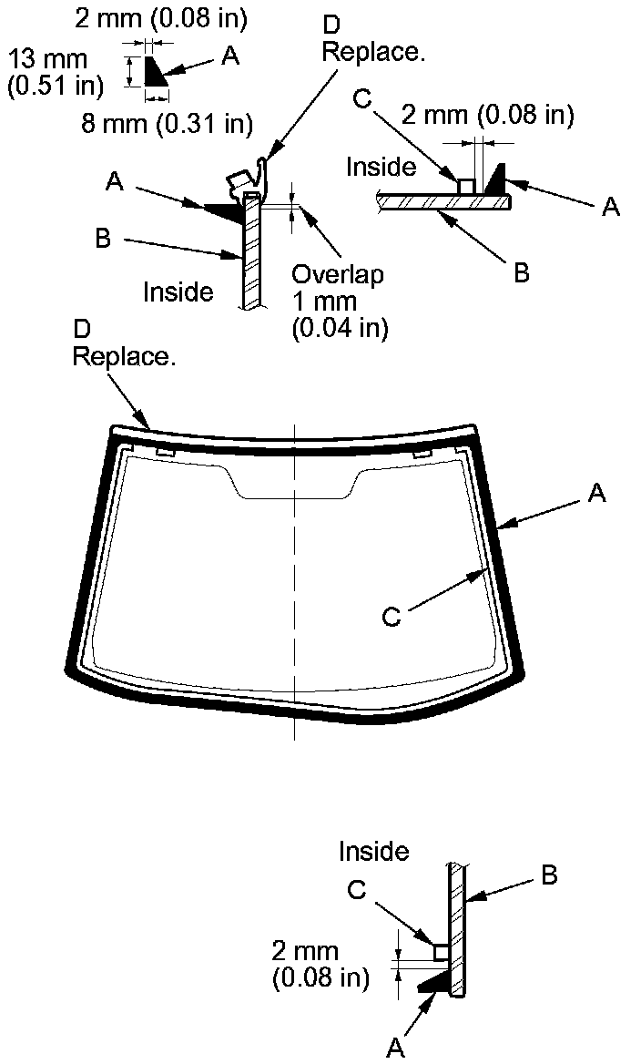 19. Put the adhesive cartridge in a caulking gun, and run a continuous bead of the adhesive (A) around the edge of the windshield (B) along the edge of the rubber dam (C) and the windshield molding (D) as shown. Apply the adhesive within 30 minutes after applying the glass primer. Make a slightly thicker bead at each corner.