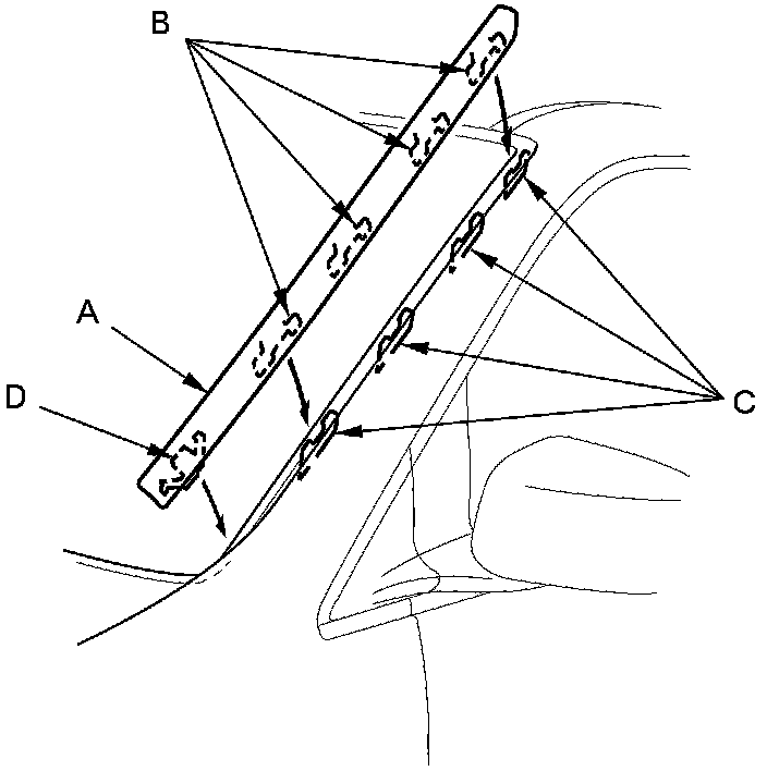 4. Remove the clips (A, B) by detaching the hooks (C) from the windshield side trim (D).