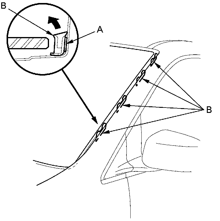 3. Starting at the bottom, remove the windshield side trim (A).