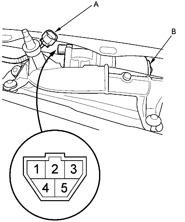 3. Disconnect the 5P connector (A) from the windshield wiper motor (B).