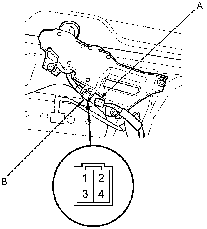 2. Disconnect the 4P connector (A) from the rear window wiper motor (B).