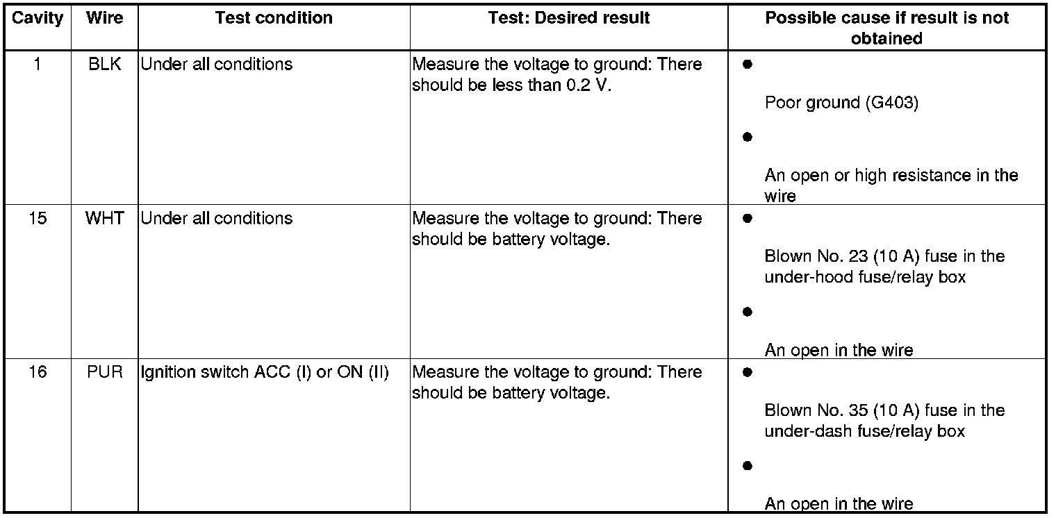 4. Reconnect the connector, and make these input tests at the connector.