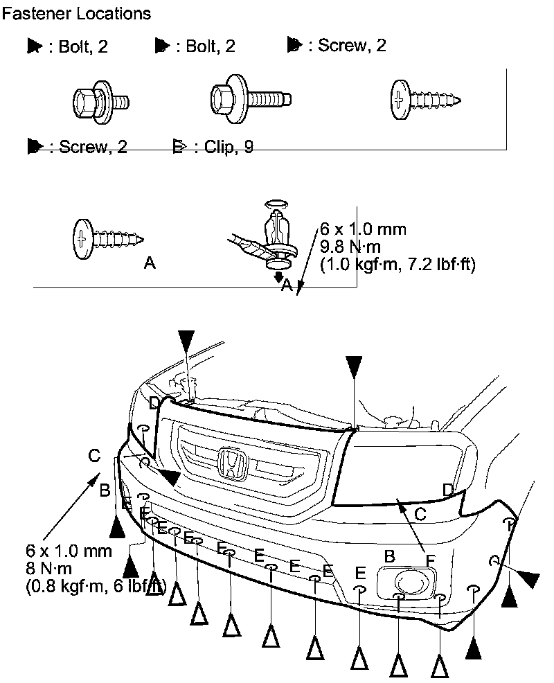 2. Remove the bolts (A, B), the screws (C, D), and the clips (E) securing the front bumper (F).