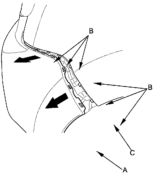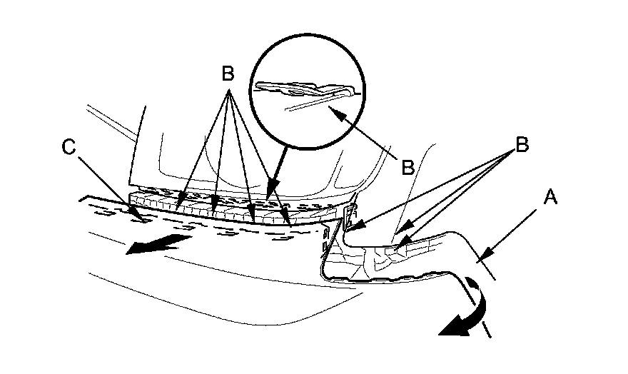 4. With the help of an assistant, while pulling the wheel arch portion away from the side spacer (A), pull the front bumper to release the bumper from the hooks (B) on the corner upper beam (C).