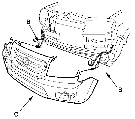 5. With the help of an assistant, disconnect the fog light connectors (A) and front corner parking sensors (B) (for some models), then remove the front bumper (C).