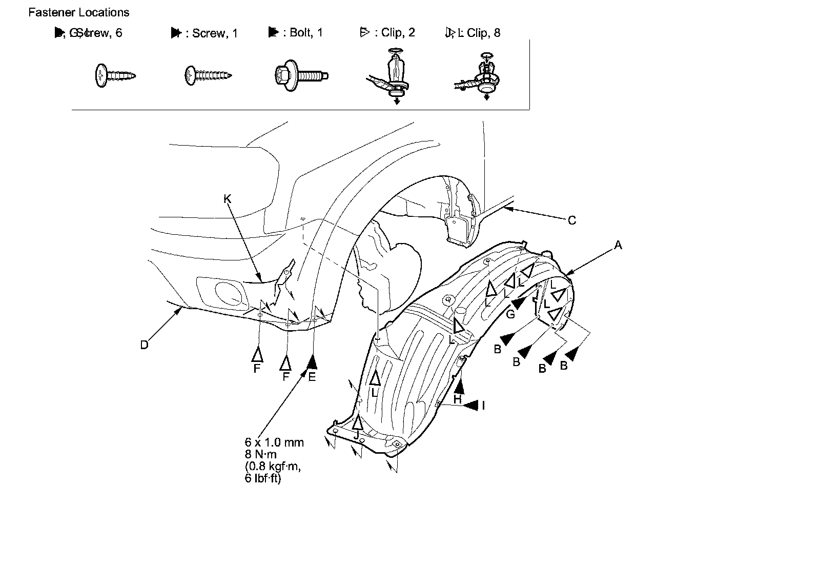 5. From the wheel arch, remove the clip (J) securing the front splash shield (K) and front inner fender, and remove the clips (L) securing the front inner fender on the body.
