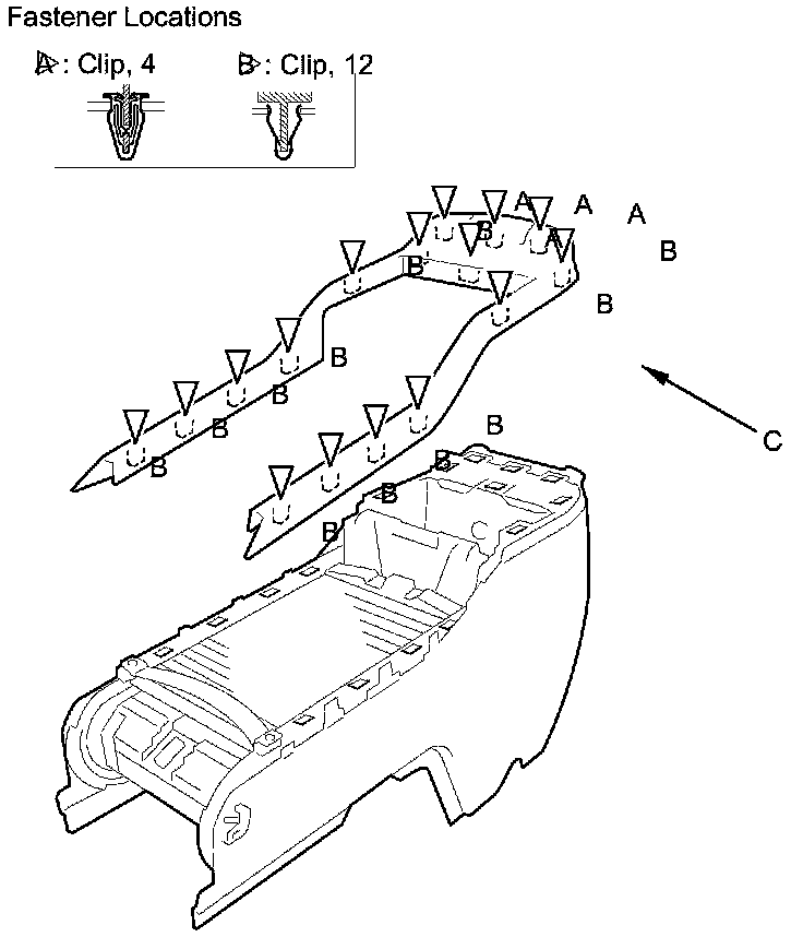2. Detach the clips (A, B), then remove the center console panel (C).
