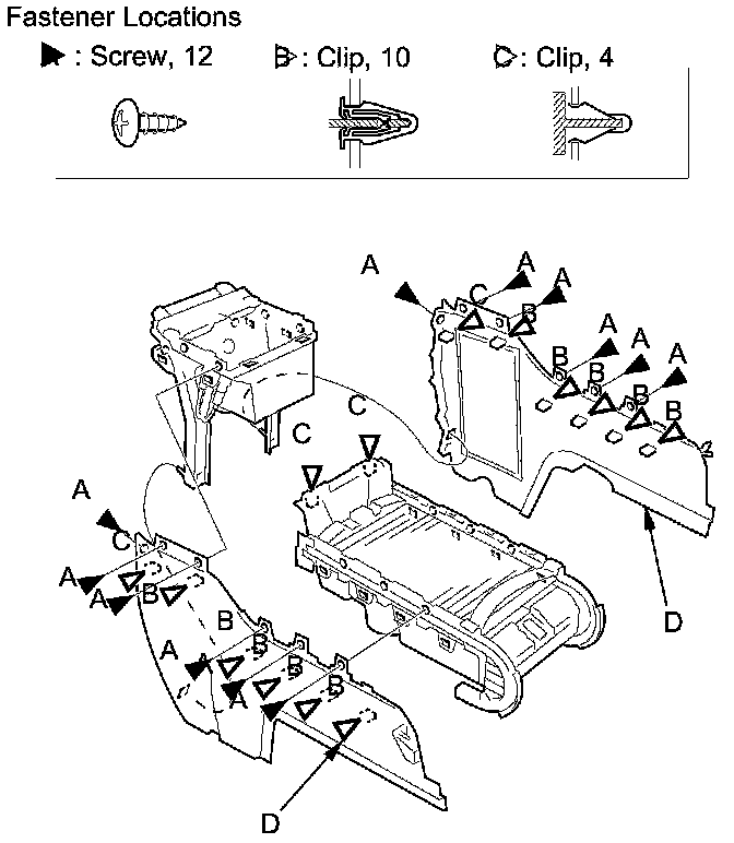 3. Remove the screws (A) and remove the clips (B, C), then remove the center console side trim (D).
