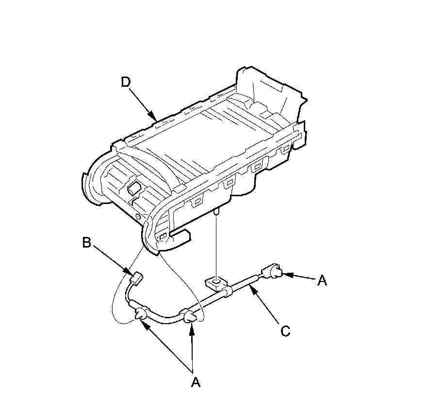 6. Detach the harness clips (A), and disconnect the front center console light bulb connector (B), then release the subharness (C) from the front console (D).