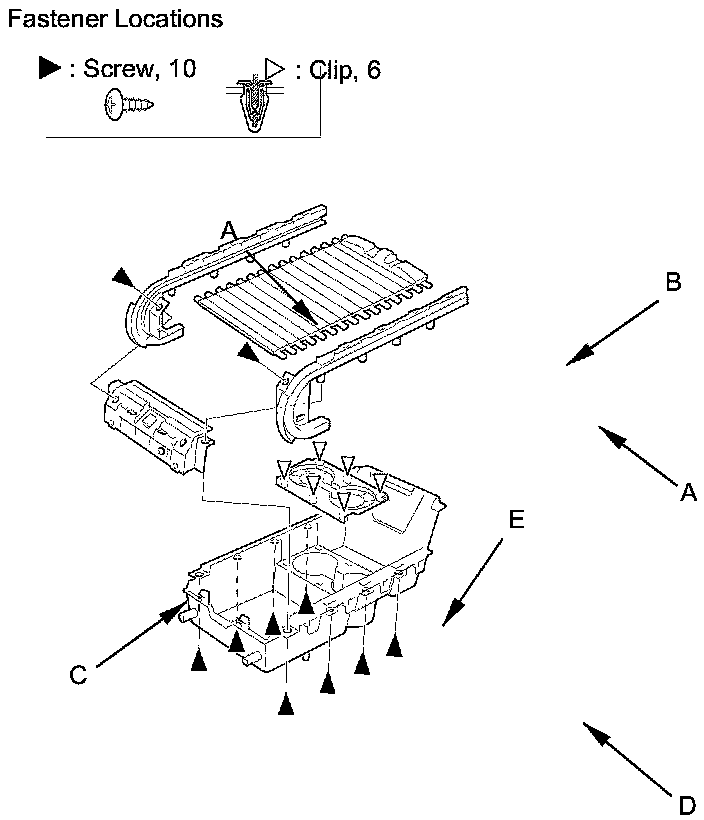 7. Remove the screws, then disassemble the rail (A), the shutter (B) and the front console cover (C) from the center console front box (D). If necessary, detach the clips, then remove the beverage holder upper cover (E).