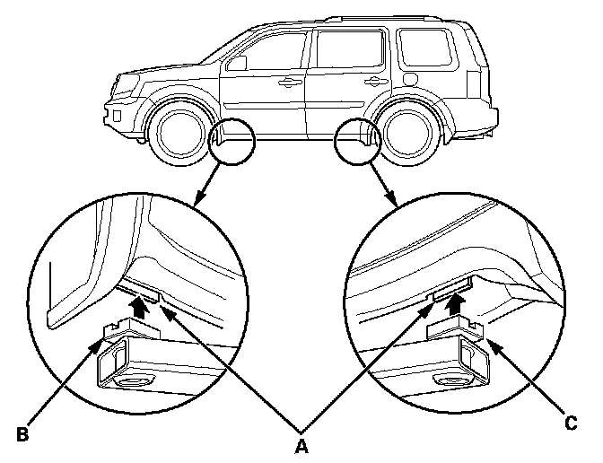1. Position the lift blocks (A), under the vehicle's front support points (B) and rear support points (C).