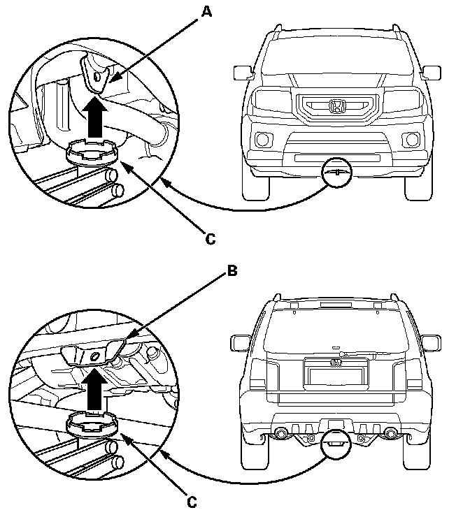 3. Position the floor jack under the front jacking bracket (A) or the rear jacking bracket (B). Center the jacking bracket on the jack lift platform (C) and jack up the vehicle high enough to fit the safety stands under it.