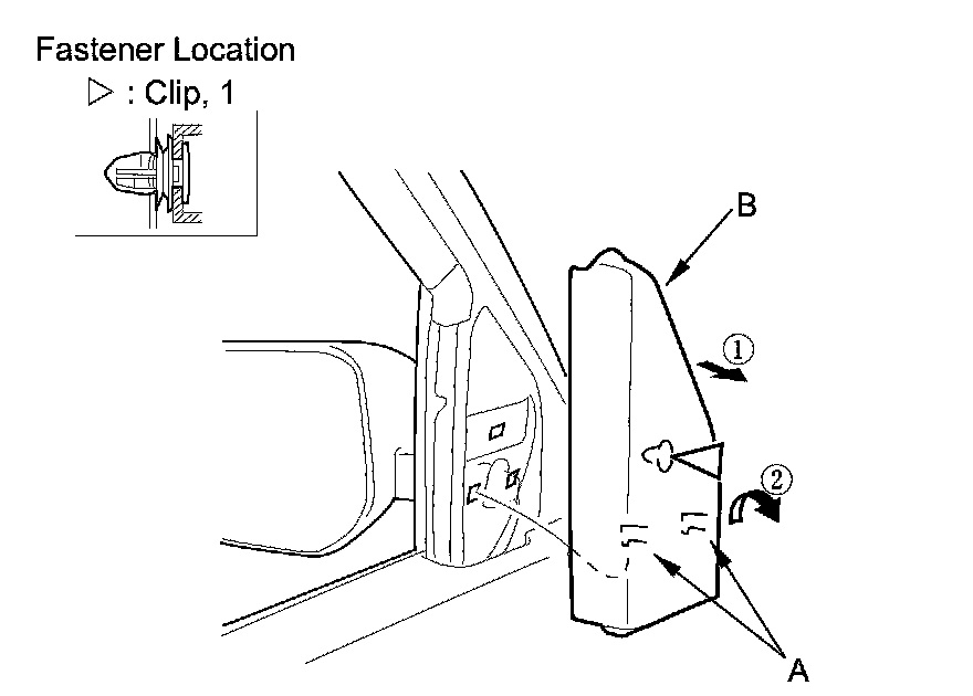 2. Carefully detach the clip, and release the hooks (A), then pry out the mirror mount cover (B) by hand in the sequence shown.