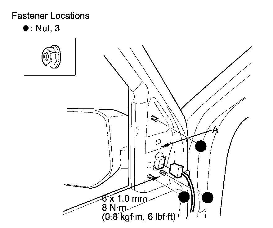 3. While holding the mirror, disconnect the connector (A), then remove the nuts.