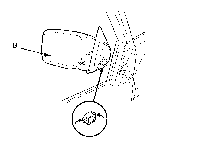 4. While holding the mirror, squeeze the sides of connector clip (A), then push out to remove the mirror (B). Take care not to scratch the door.