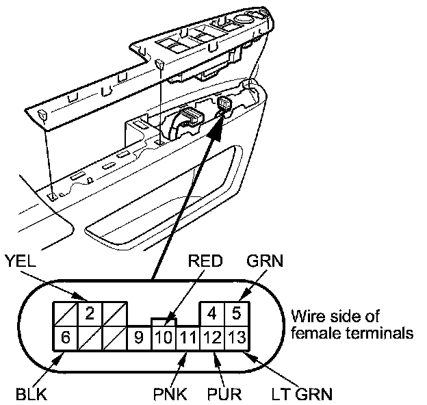 4. Measure the voltage between body ground and the terminal No. 2 of the power mirror switch 13P connector with the ignition switch to ON (II). There should be battery voltage.