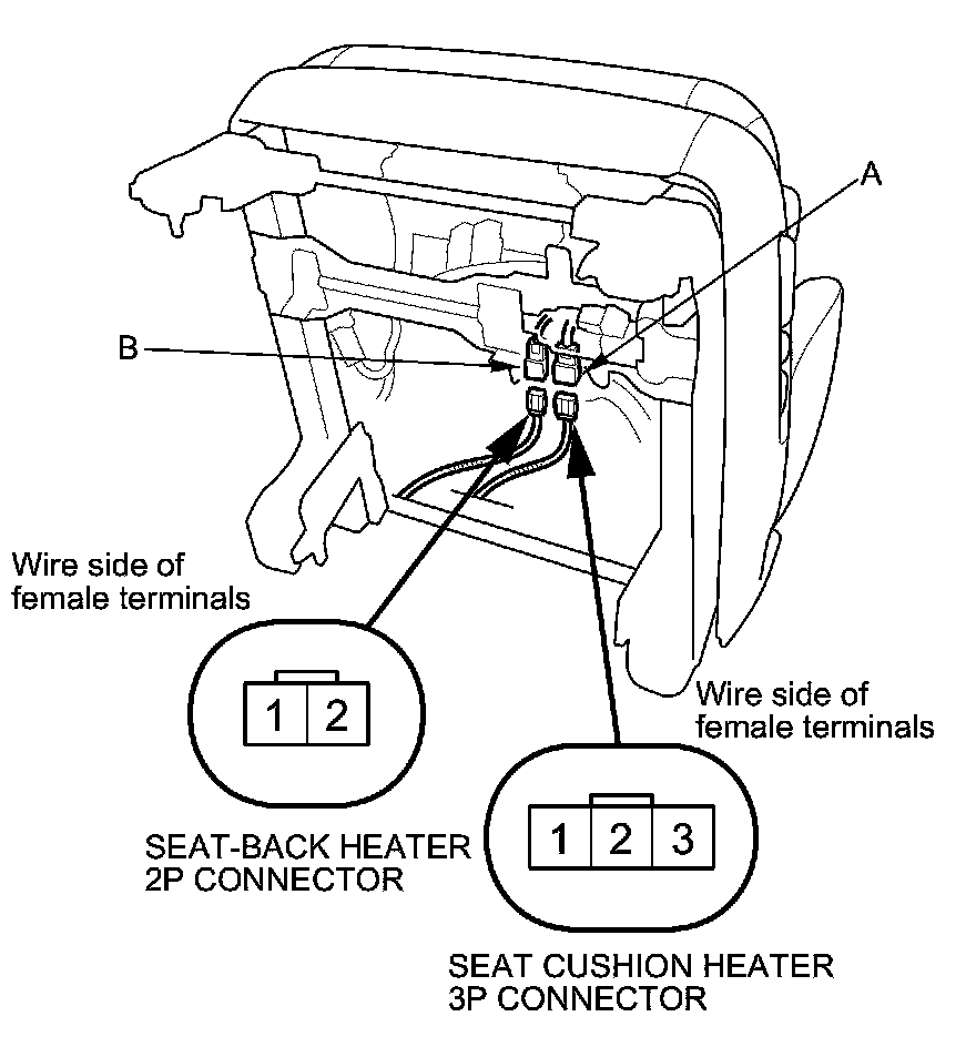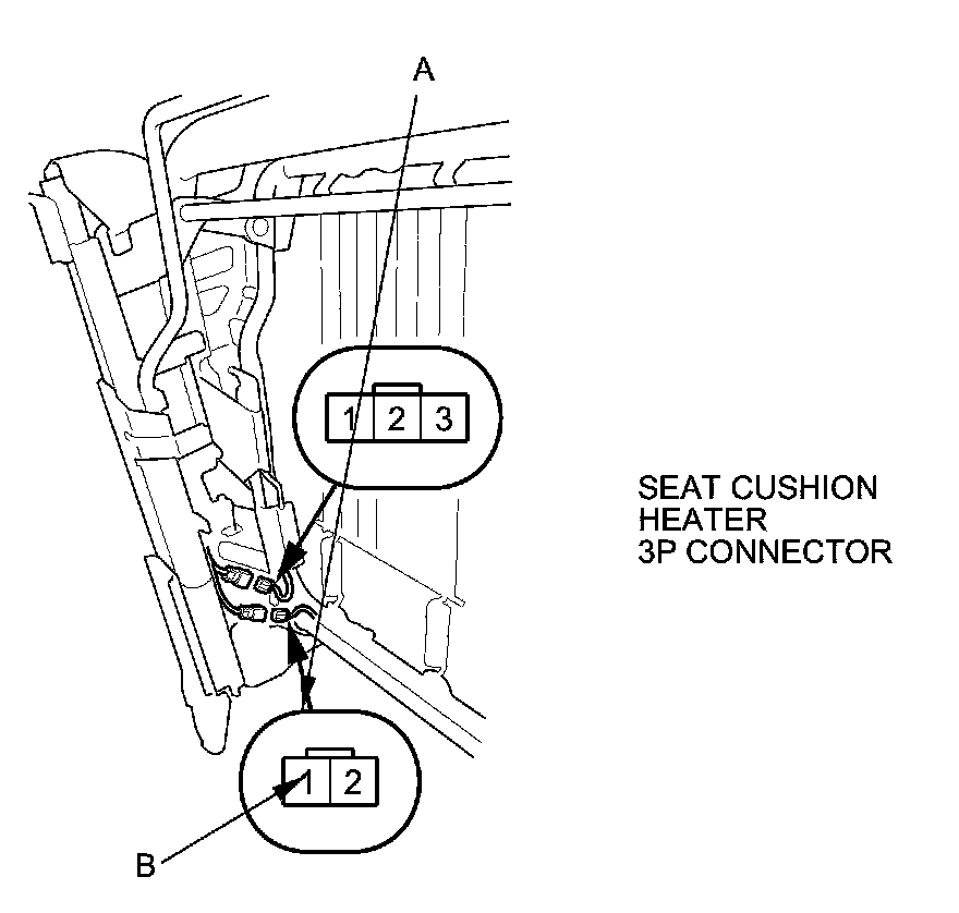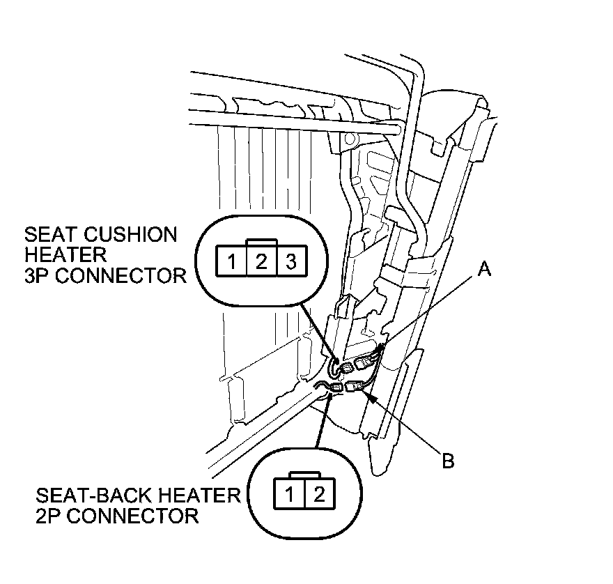 2. Disconnect the 3P connector (A) and 2P connector (B) from the seat heater.