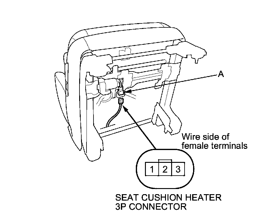 4. Check for continuity between seat cushion heater 3P connector terminals No. 1 and No. 2, and terminals No. 2 and No. 3. There should be continuity.