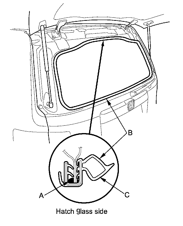 6. Locate the painted alignment mark (C) on the hatch glass weatherstrip. Align the painted mark with the alignment notch in the center of the hatch glass opening, and install the weatherstrip. Make sure it's seated completely and facing in the direction shown. Make sure there are no wrinkles in the weatherstrip.