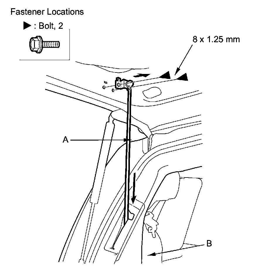 2. With power tailgate: Remove the pivot bracket mounting bolts, then lay the power tailgate rod (A) against the D-pillar trim (B).