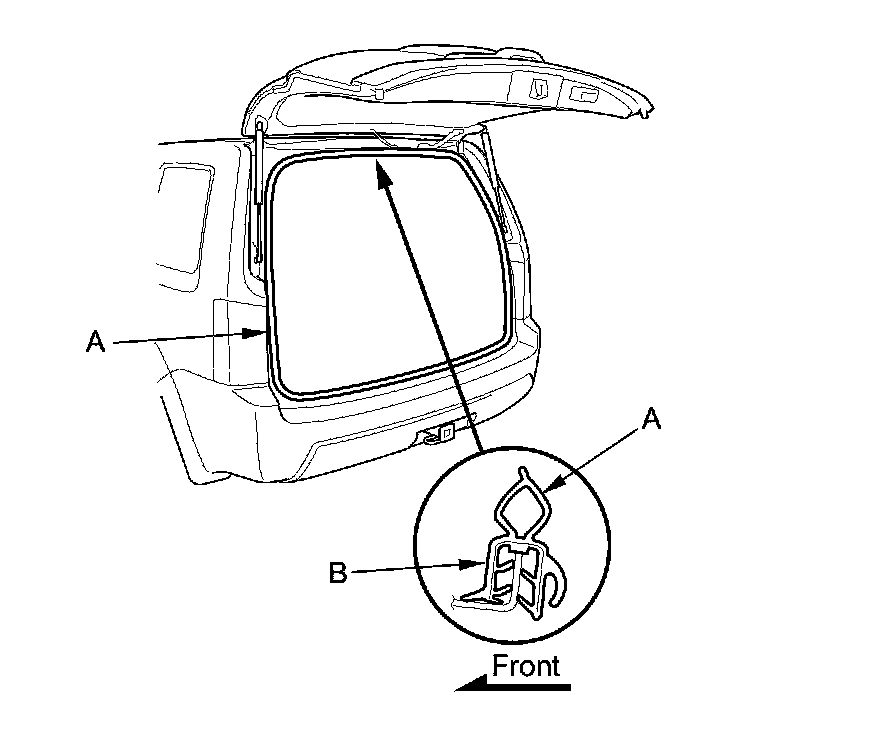 4. Locate the painted alignment mark (B) on the tailgate weatherstrip. Align the painted mark with the alignment notch in the center of the tailgate opening, and install the tailgate weatherstrip all the way around. Make sure there are no wrinkles in the weatherstrip.