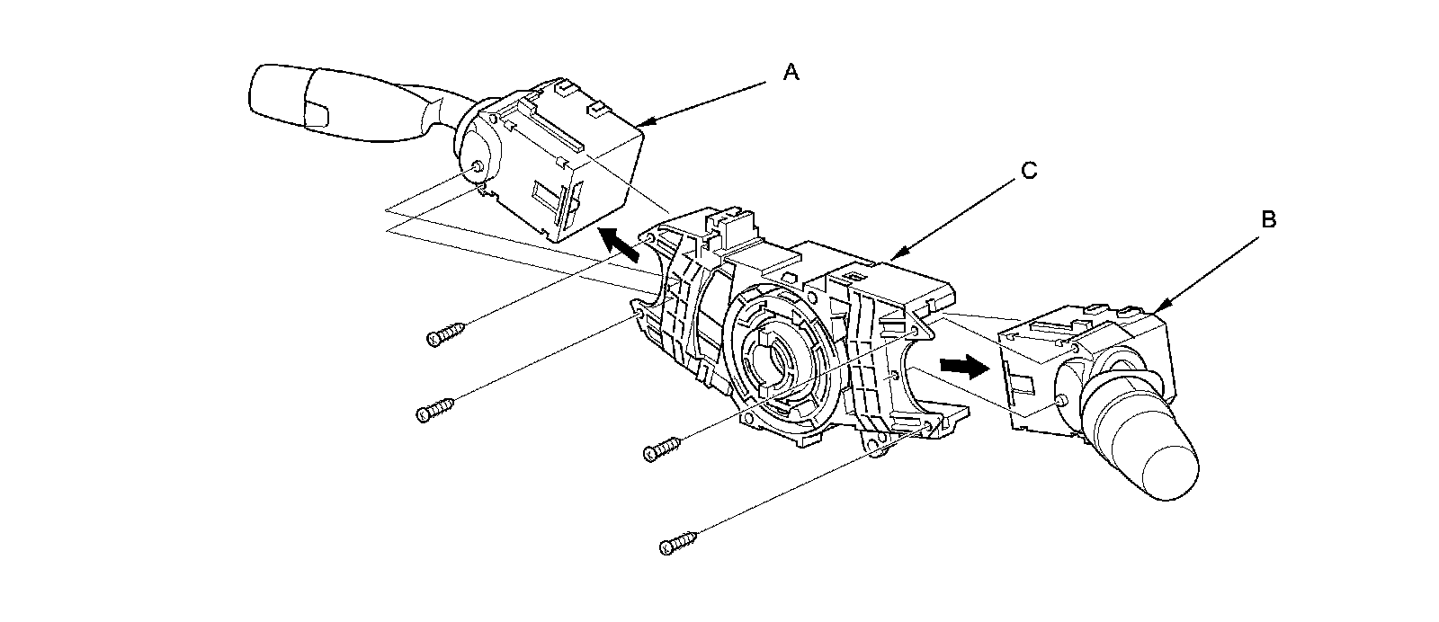 4. Remove the combination light switch (A) and the wiper/washer switch (B) from the combination switch body assembly (C).