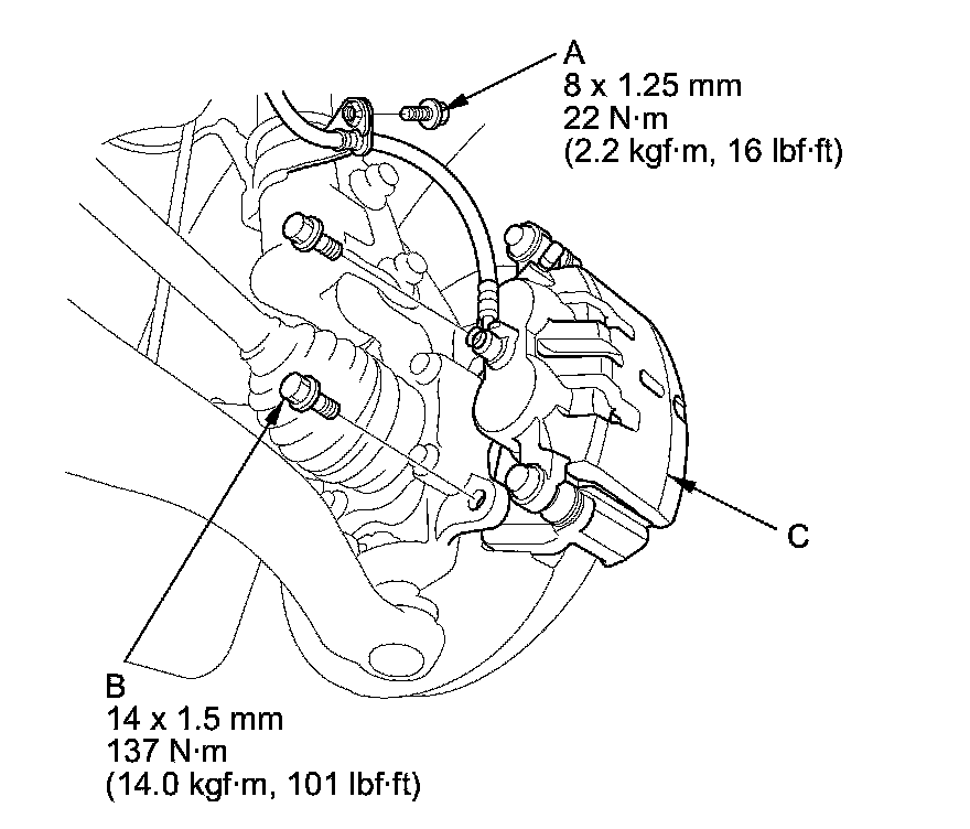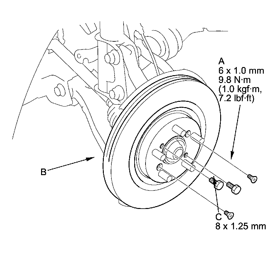 NOTE: If the brake disc is stuck to the hub bearing unit, thread two 8 x 1.25 mm bolts (C) into the brake disc to push it away from the hub bearing unit. Turn each bolt 90 degrees at a time to prevent the brake disc from binding.