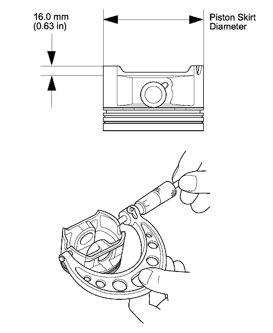 3. Measure the piston skirt diameter at a point 16.0 mm (0.63 in) from the bottom of the skirt.
