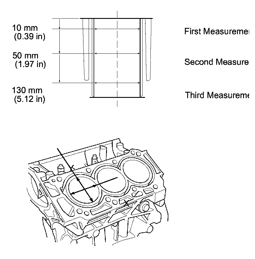 4. Measure the wear and taper in direction X and Y at three levels in each cylinder as shown. If measurements in any cylinder are beyond the oversize bore service limit, replace the engine block. If the engine block has to be rebored, refer to step 7 after reboring.