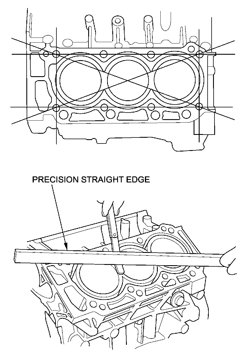 6. Check the top of the engine block for warpage. Measure along the edges and across the center as shown.