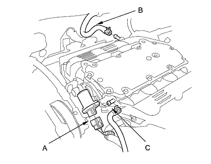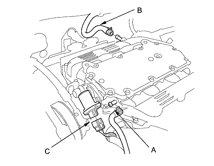 3. Disconnect the positive crankcase ventilation (PCV) hose (A), the brake booster vacuum hose (B), and the intake manifold tuning (IMT) actuator connector (C).