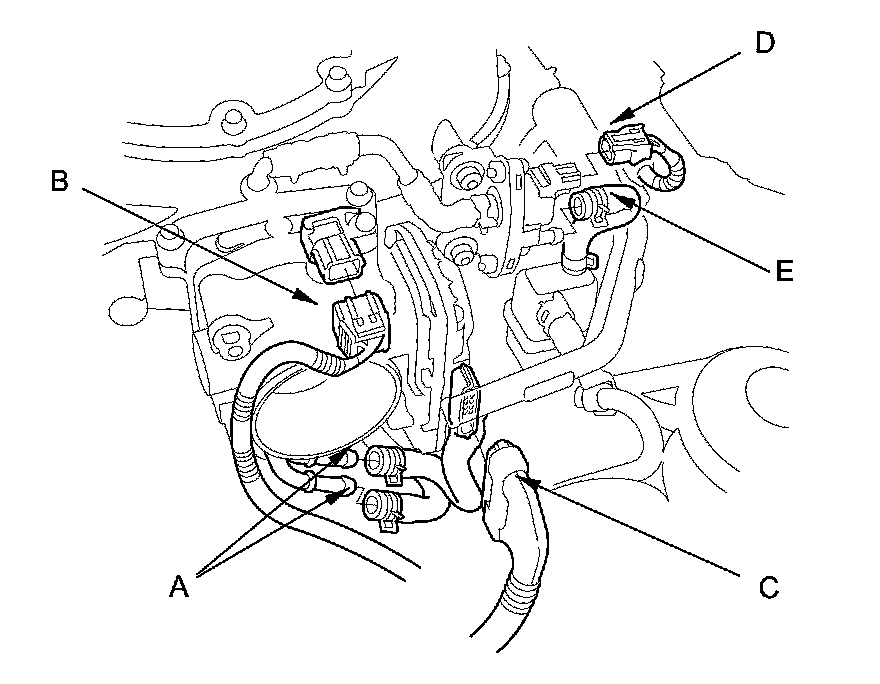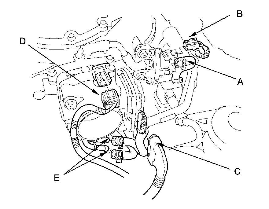4. Connect the MAP sensor connector (B), the throttle actuator connector (C), the EVAP canister purge valve connector (D), and the EVAP canister hoses (E).