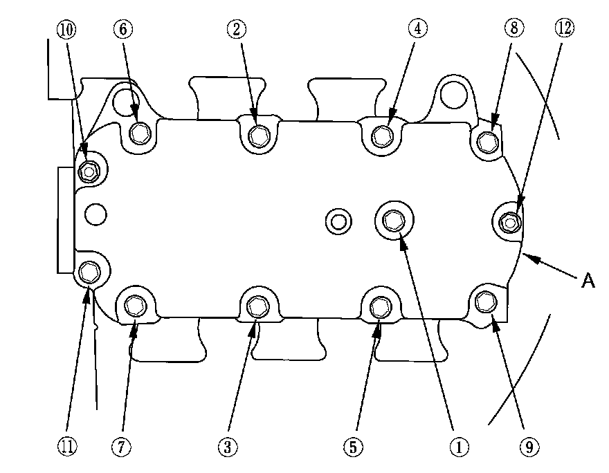 6. Remove the upper cover mounting bolts and nuts sequentially in three steps, then remove the upper cover (A).