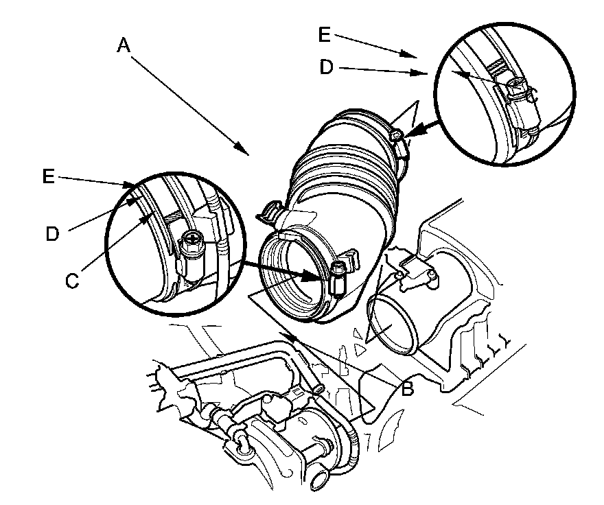 NOTE: When tightening the screw of the hose band (C), align the edge of the hose band (D) with the mark (E) painted on the hose band. If you tighten the screw over the mark, replace the hose band.