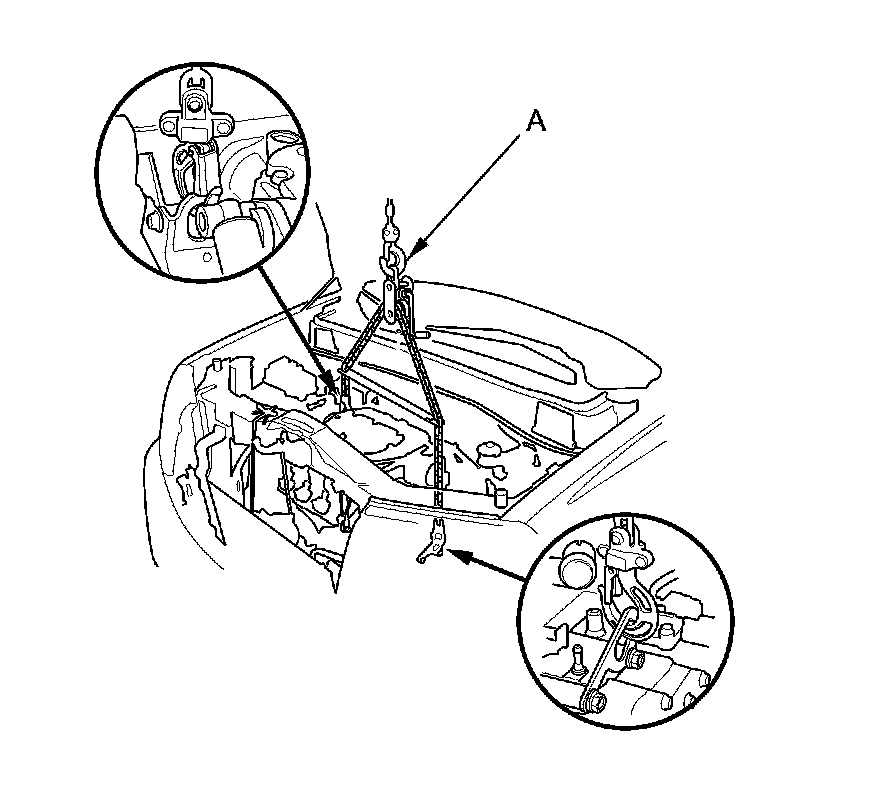 2. Position the engine/transmission under the vehicle. Be sure that they are properly aligned. Carefully lower the vehicle until the engine/transmission are properly positioned in the engine compartment. Make sure the vehicle is not resting on any part of the engine/transmission. Support the engine/transmission with a chain hoist (A) and carefully raise the engine/transmission into place.