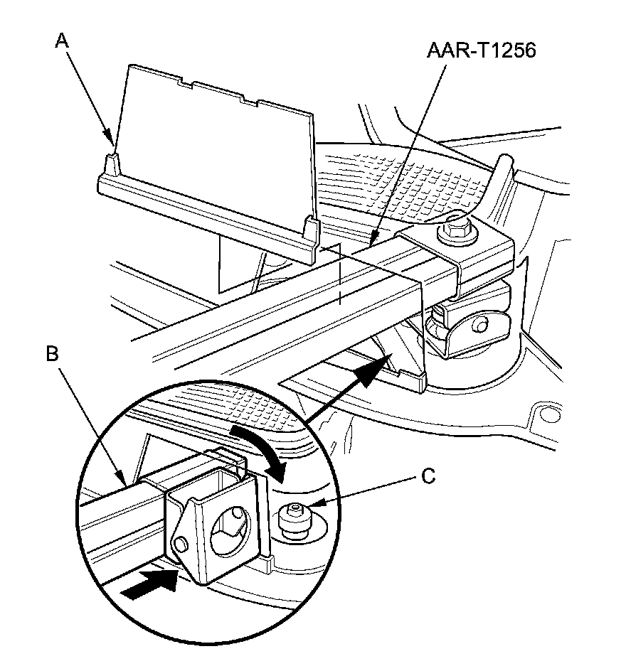 4. With the engine support hanger (AAR-T1256) on its side, insert the hanger beam (B) through the opening, then rotate it over the damper (C).