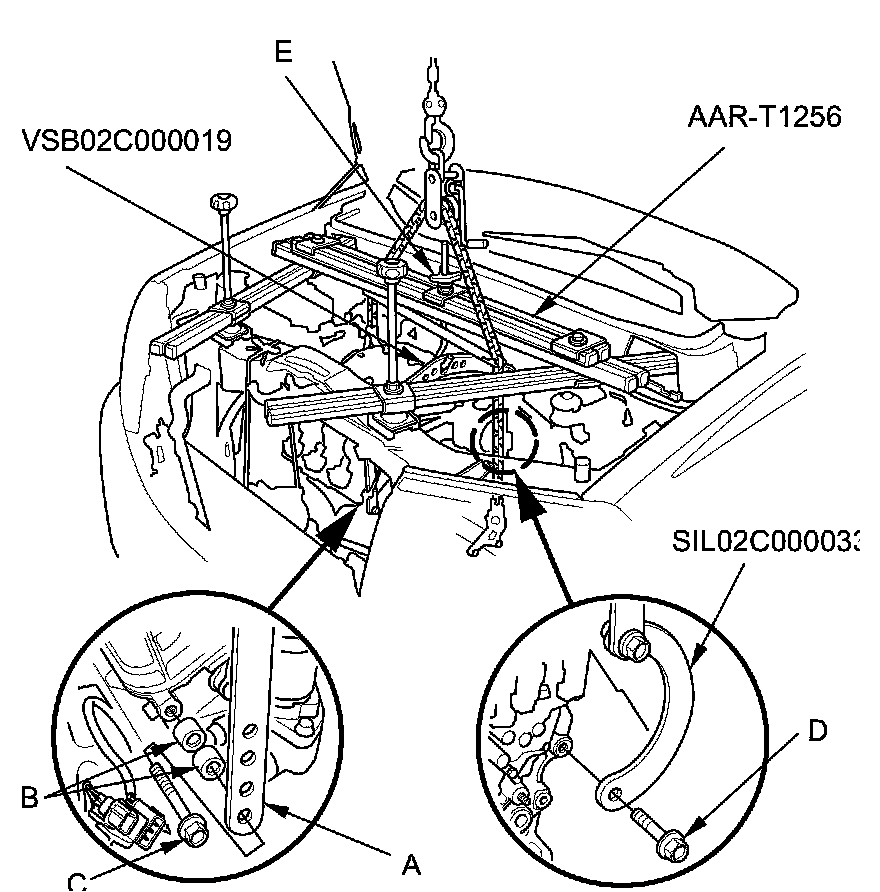 6. Install the engine support hanger (AAR-T1256) onto the vehicle as shown, and attach the hook to the slotted hole in the engine hanger balance bar. Tighten the wing nut (E) by hand, and lift and support the engine/transmission.