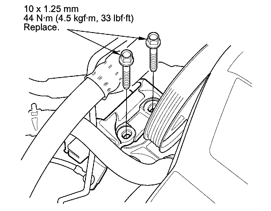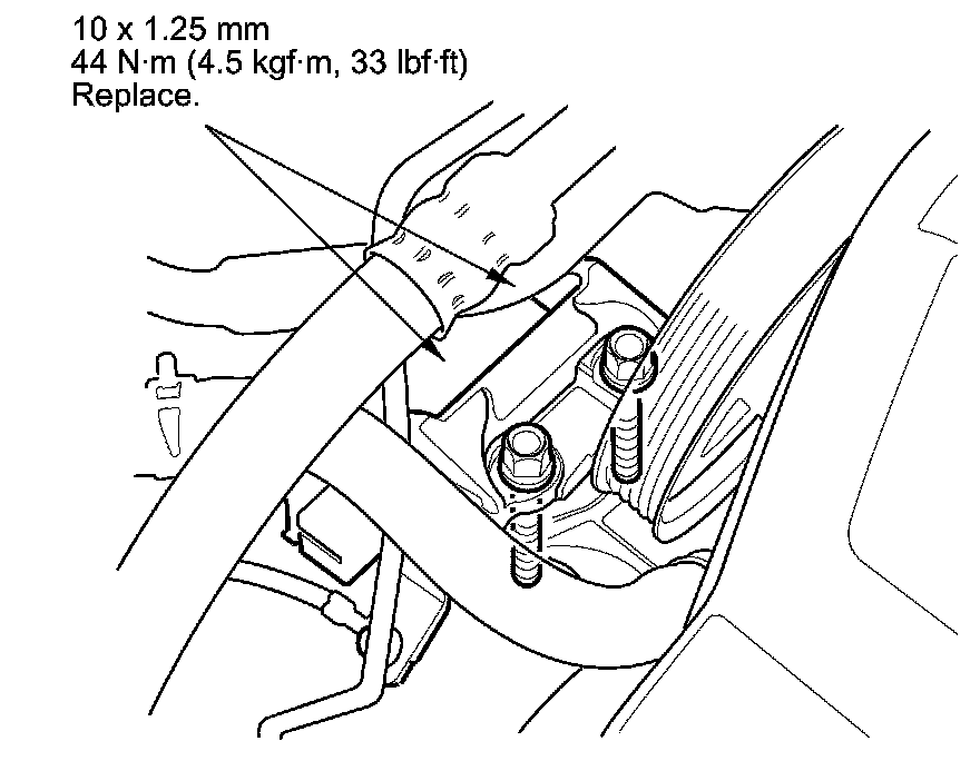7. Install the new mounting bolts into the upper half of the side engine mount bracket. Tighten the bolts to the specified torque.