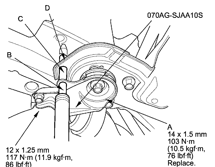 10. Loosely install the left rear subframe mounting bolt (A); insert the 15.7 mm side of the subframe alignment pin (070AG-SJAA10S) through the positioning hole (B) on the rear stiffener, through the positioning hole (C) on the subframe, and into the positioning hole (D) on the body, then tighten the left rear subframe mounting bolt.