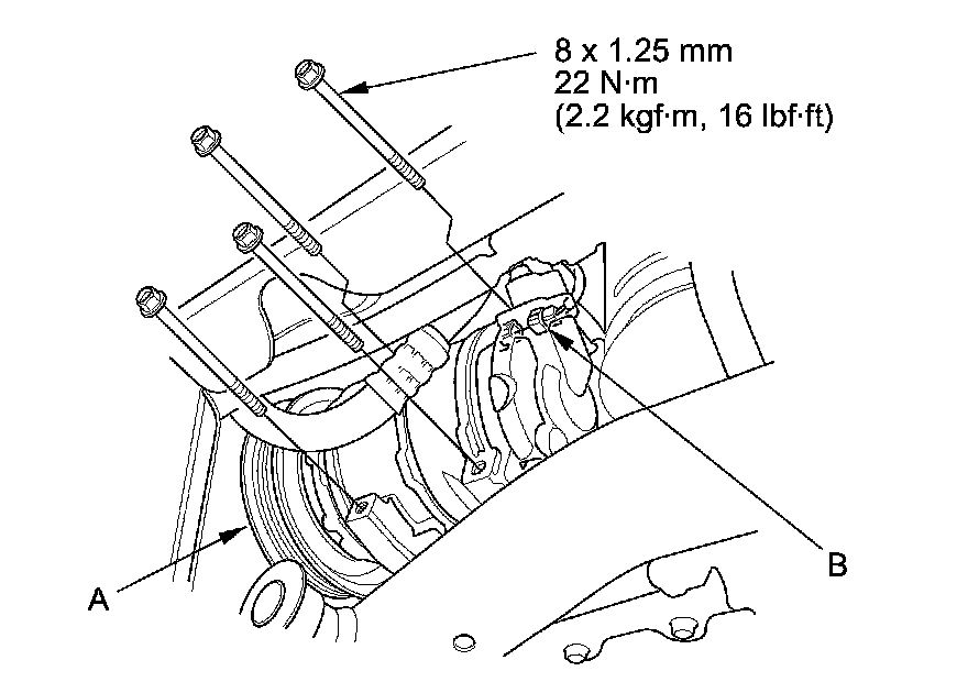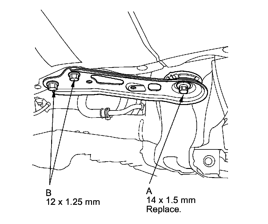 14. Tighten the rear-passenger's side subframe mounting bolt (B) to the specified torque.
