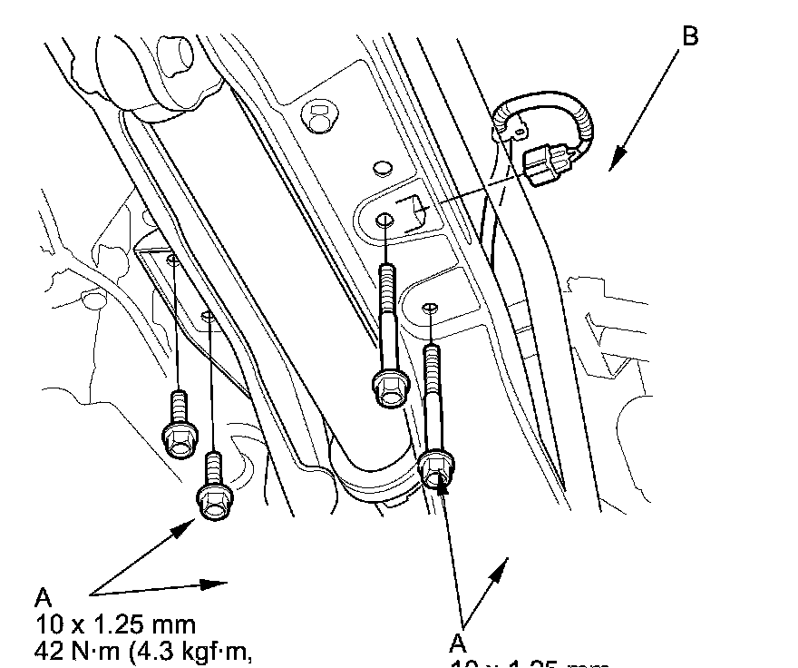 12. Loosely install the right and left front subframe mounting bolts (A) and stiffener mounting bolts (B).