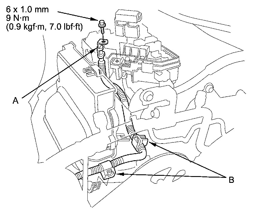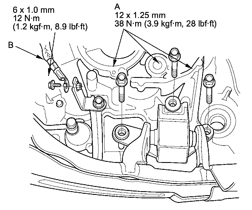 21. Tighten the rear engine mount bolts (A), and connect the rear engine mount actuator connector (B).