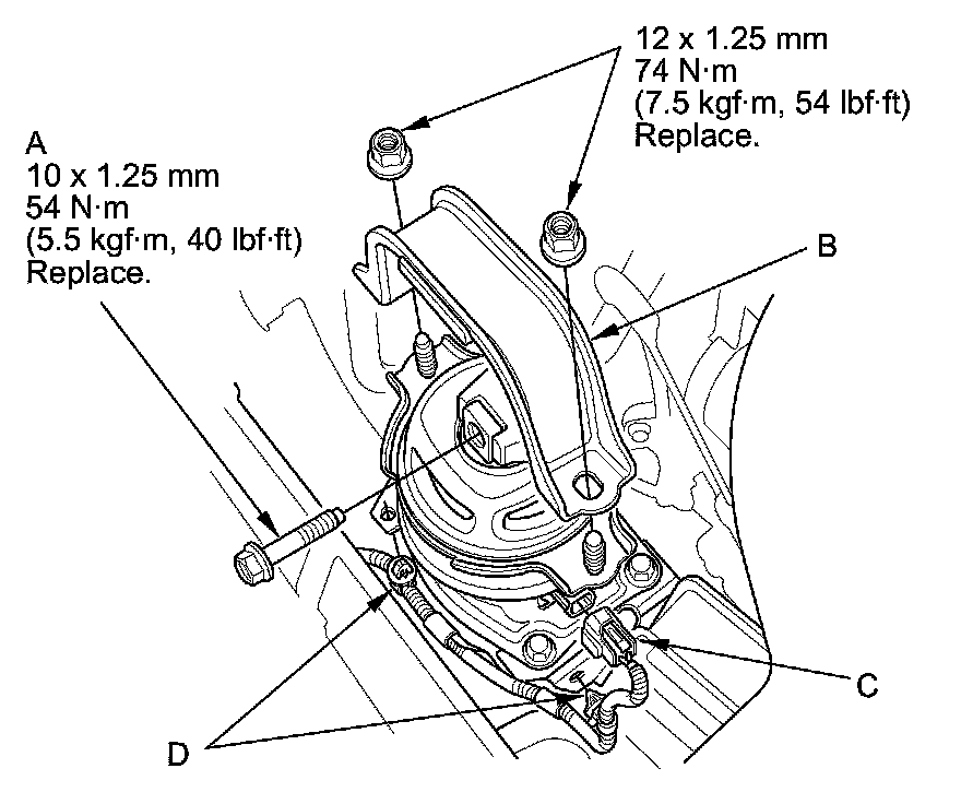 25. Tighten the front engine mount bolt (A), then install the front engine mount stop (B). Connect the front engine mount actuator connector (C) and the harness clamps (D).